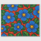 The design features large stylized flowers with rounded petals in rich shades of blue. Each flower has yellow center made of small circular details that add contrast and visual interest. The flowers are surrounded by smooth, pointed green leaves in different tones, giving a fresh and natural feel. The background is filled with a strong red color that enhances the vibrancy of the blue and green elements. Small yellow dots are scattered throughout the design, adding a playful and decorative touch. The overall style is flat, clean, and bold, with clear outlines and strong color harmony.