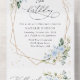 Invite friends and family in style and set the tone for your special day with this charming birthday invitation. Design features blue and white watercolor flowers, greenery, gold confetti and gold frame on white background.