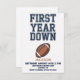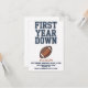 Whether you are hosting a tailgate party, a backyard BBQ, or a sports-themed indoor bash, this invitation sets the perfect tone for a "Rookie Year" celebration. The design highlights the fun pun "First Year Down" with bold, collegiate-style typography and football graphics.