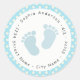 Circular Pastel Blue Polka Dots Baby Shower Return Address Label with cute foot print image.