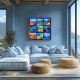 This striking abstract art print features a bold blue-framed grid of vibrant desert landscapes. Each section showcases a geometric mix of mountains, cacti, and desert plants in rich tones of blue, orange, and purple. The structured grid design combined with the intense colours makes this artwork a standout piece, ideal for modern home or office décor. Perfect for lovers of abstract nature art, this print adds a splash of colour and geometric balance to any space.