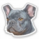 Elegant semi-realistic portrait of a blue French Bulldog: three-quarter angle highlights grey-blue fur texture, amber eyes with catchlights, bat ears, and muzzle wrinkles in soft painterly style with oval vignette. Dog moms of rare blues, customise for prints, stickers, or mugs.