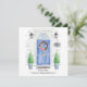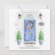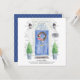 Announce your new address with our stylish announcement featuring a blue front door, welcome mat, slate sign, topiaries and a floral wreath set on a grey brick background.