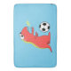 Customisable funny soccer bathmat with a colourful illustration of a funny dinosaur with a fire breath playing soccer on blue background. This funny dinosaur design would make a great gift for boys and men who love playing soccer.