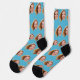 Funny custom women's face crew socks personalised with a photo cut-out and a blue background. Upload the face with a transparent background and it will automatically be replicated all over the socks, on both sides. To make the cut-out, you can download any mobile or computer app, or use the program named Canva or Photoshop.