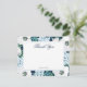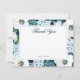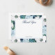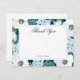 A modern floral thank you note features white garden roses, blue hydrangea and green leaves on a navy blue background. Elegant script typography adds an elegant touch. Personalisation appears at the bottom.