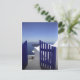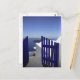 Photograph of a blue gate with a view out to sea, Santorini, Greece