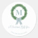 Round sticker gift tag featuring a beautiful wreath with blue gingham bow design and personalisation with the giver's last initial and name