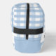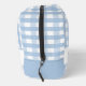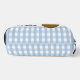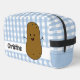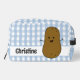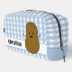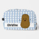 Adorable toiletry bag featuring a cute happy cartoon brown potato. The background is a cute classic pattern of blue and white gingham. A template to add your name to personalise.
