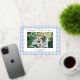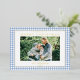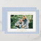 Create your own custom photo Christmas cards featuring one of your favourite family pictures alongside personalised minimalist typography family name and year on a cute blue gingham plaid pattern background.