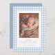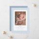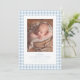 Introduce your new baby with this sweet and simple blue gingham birth announcement. The front of the classic design features a frame of blue and white checks with a single vertical photo along with customisable type and plenty of room for baby's name, birth date, stats and more. The back is a coordinating dusty blue with white dots and features room for a second photo. This design is part of the "oh baby" gingham collection by Lea Delaveris Design and is also available in other colours and as a digital birth announcement download. Find coordinating pieces like envelopes, envelope liners, thank you notes and more in the collection.