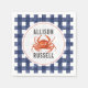 Paper napkins featuring an illustration of a crab over a blue gingham background. Personalise the names.