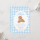 Celebrate your little one’s first birthday with this charming “One Golden Year” invitation featuring an adorable golden doodle puppy wearing a blue gingham bow. The background showcases a sweet light blue gingham checkered border with a scalloped white frame, perfect for a boy’s first birthday party. Fully customizable with your child’s name, party details, and RSVP information.