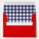 A red envelope featuring a blue gingham design inside. Look for matching items at Jill's Paperie.