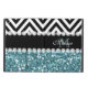 GIRLY LIGHT BLUE GLITTER (PRINTED EFFECT) WITH BLACK AND WHITE CHEVRON PATTERN, MONOGRAMMED WITH YOUR NAME, YOUR INITIAL OR MONOGRAM ON A BLACK STRIPE OR BAND WITH A BORDER OF PRINTED WHITE DIAMONDS. TRENDY, CHIC COOL CUTE DESIGN FOR HER, THE TRENDSETTER, THE FASHIONISTA