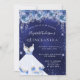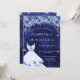 A modern, stylish and glamourous invitation for a Quinceañera, 15th birthday party. A midnight blue background with faux glitter dust, a dress and blue florals. The blue colour is uneven. The name is written with a modern hand lettered style script. Personalise and add your party details.