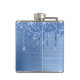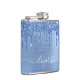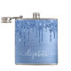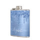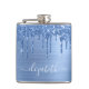 Personalised elegant and girly flask with blue faux glitter dripping down a blue faux brushed metallic background. Personalise with your name in a stylish white script with swashes.