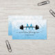 Modern fitness business cards featuring a blue marble & glitter background, a barbell weight silhouette, a signature script, and a professional text template that is easy to personalise. This would be perfect for a personal trainer who works in a gym, or for a self-employed health coach.