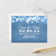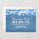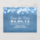 Vintage yet modern blue save the date postcard with faux glitter foil / confetti background and shimmering string lights. Please note that this design does not use any physical glitter it will be printed the way you see it on your computer screen.