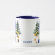 This fun Holiday mug has a funny little gnome holding a gold banner with green text that says "Happy Holidays!" He is dressed in blue, with a gold bell at the tip of his hat. Behind him are snow covered pine trees, and a little bird perches on the end of his long white beard. The image is printed on two sides, and your custom text is in matching blue at the centre between the images.