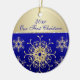 Remember your special day with this beautiful festive navy and royal blue with gold faux glitter (PRINTED) snowflakes round shaped ceramic first Christmas together keepsake ornament that can be customised with the names of the bride and groom, and the year. You can customise the text to say whatever you want and use them as a wedding favour at your winter or Christmas wedding, or as decorations for your venue centerpieces or decor. ****PLEASE be sure your text is placed where you want it, as it will print out as it appears on your monitor. Zazzle will NOT correct anything. It also matches the wedding invitation shown below. If you would like a different shape, or if you need any assistance, please email niteowlstudio@gmail.com.