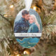 This holiday keepsake ornament features your own photograph, with a bottom border of an abstract blue, black, teal and gold pattern that resembles a cut agate. A silver grey banner holds your customised text in black. The back of the ornament has the faux agate border at top and bottom, with additional text fields at the black centre. This makes a nice keepsake gift for newlyweds or any couple.