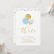 Celebrate a special day for your loved one with this cute 3rd birthday invitation! This design features stylish typography "Three" with balloons and confetti in light blue, grey, and gold colour combo. Match your invitation to your birthday party decorations. Perfect invitation for a modern first birthday party for a boy or girl.