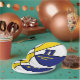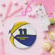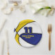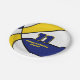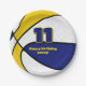 This basketball themed party plate for a basketball birthday or team party features the image of a basketball that has alternating blue, white and gold panels - customise the text in blue and gold - by katz_d_zynes