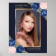 Elegant blue floral photo celebration of life/funeral welcome sign featuring blue and pink roses and baby's breath flowers decorating a photo inside a gold frame. Matching items available.