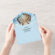 A beautiful design featuring faux sparkling clam and conch shells which appear to shimmer and shine with a mother of pearl sheen are set against a very pale blue background which has ocean wave splashes across it. There are black font templates for your personalised wording and the tear off strip at the bottom has a dark blue with faux gold glitter band across on which a pretty seashell rests. This budget friendly design is ideal for coastal destination, beach theme, tropical and island birthday parties and weddings.