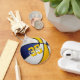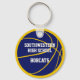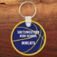 This cool basketball themed keychain features the realistic image of a basketball that has alternating blue, white and gold recolored panels on the front and a simple blue basketball shape on the back - easily personalise with player name & jersey number on the front and school or club name & mascot name on the back - by katz_d_zynes