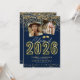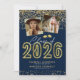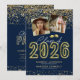 Celebrate two graduates with these stylish 2024 graduation party invitations featuring photos of the grads, a trendy blue background, faux gold glitter, the title "class of 2024" in a script and gold neon sign, and a modern text template that is easy to personalise.