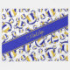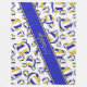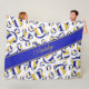 This cute volleyball team colours fleece blanket for girls features a pattern of varied size stylised blue, gold and white volleyballs turned every which way overlying a volleyball net detail graphic - the volleyballs' blue and gold panels are blended with an artsy, girly floral pattern - personalise her name in a sophisticated handwritten font on a bold, angled, full width blue colour strip - white background and blue colour strip are customisable - by katz_d_zynes