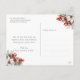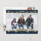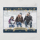 Elegant blue and gold botanical photo Happy New Year postcard featuring a blue photo frame adorned with holly, berries and falling snow on the front and a watercolor painting of poinsettia, holly and red berries at the back.