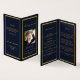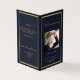 An elegant 4-page program. A dark blue background, a faux gold frame and space for your photo. Personalise and add name, dates and your text.