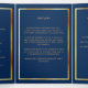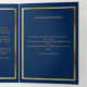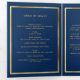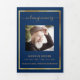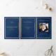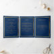An elegant tri-fold program. A navy blue background, a faux gold frame and space for your photo. Personalise and add name, dates and your text.