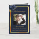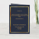 An elegant 4-page program. A dark blue background, a faux gold frame, blue florals and space for your photo on the front. Personalise and add name, dates and your text.