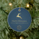 An elegant winter blue and gold holiday business ornament for small business use. Simply edit the business logo before purchasing and deliver some winter holiday joy to your MVP clients and customers! Features a gold jumping deer with antlers against a deep seasonal blue background.