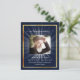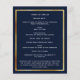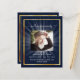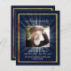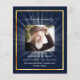 An elegant 2-page program. A dark blue background, a faux gold frame, and space for a photo. Light beams behind the photo. Personalise and add name, dates and your text.