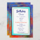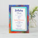 A vibrant modern elegant blue and gold framed blue, gold, red and orange abstract watercolor 60th birthday dinner invitation.