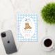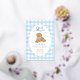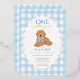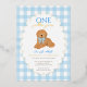 Celebrate your little one’s first birthday with this charming “One Golden Year” invitation featuring an adorable golden doodle puppy wearing a blue gingham bow. The background showcases a sweet light blue gingham checkered border with a foiled scalloped frame, perfect for a boy’s first birthday party. Fully customizable with your child’s name, party details, and RSVP information.