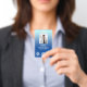 Vertical office employee badge with a simple design against a gradient from pale blue to sky blue. Add a photo of the employee along with name and profession. Personalise further with three business logos.