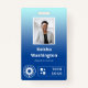 Vertical office employee badge with a simple design against a gradient from pale blue to sky blue. Add a photo of the employee along with name and profession. Personalise further with two business logos.