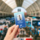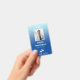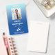 Vertical office employee badge with a simple design against a gradient from pale blue to sky blue. Add a photo of the employee along with name and profession. Personalise further with your business logo.