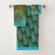 This towel set features the mystical colours of Caribbean abalone! A bright teal border accents the iridescent swirls. Create an exotic underwater feeling for your bath. We offer a matching shower curtain to complete your grotto.