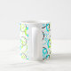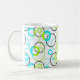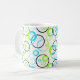 blue green and black rings and circles on white coffee mug