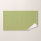 This towel set has a blue washcloth, a green hand towel, and a bath towel with a geometric design of blue, green, and brown dots.