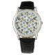 This men's watch has a geometric design of blue, green, and brown dots.