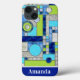 This phone case has a square block art deco pattern in digital stained glass and an area for a name at the bottom. A colourful geometric design in colours of blue, aquamarine and green. The case makes a great gift or a treat yourself present. You can make the pattern on this phone case bigger or smaller and personalise with your name. Or take the name and rectangle off for just a patterned phone case.