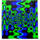 This shower curtain features a bold blue and green psychedelic design with flowing abstract waves and hypnotic symmetry. The high-contrast colors and dynamic pattern create a striking, modern look with a strong retro vibe.